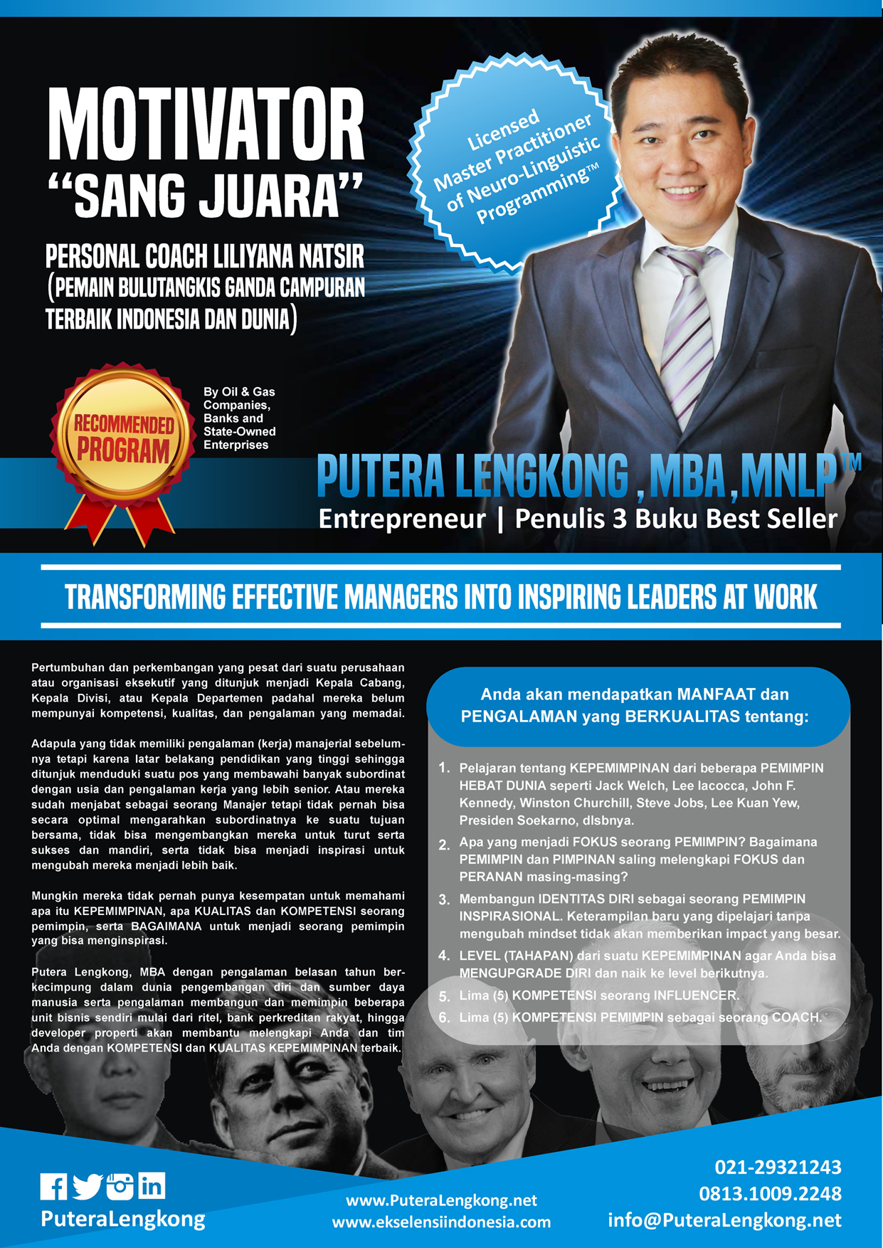Putera Lengkong, MBA dengan pengalaman belasan tahun berkecimpung dalam dunia pengembangan diri dan sumber daya manusia serta pengalaman membangun dan memimpin beberapa unit bisnis sendiri mulai dari ritel, bank perkreditan rakyat, hingga developer properti akan membantu melengkapi Anda ataupun tim Anda dengan KOMPETENSI dan KUALITAS KEPEMIMPINAN terbaik.